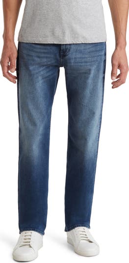 Whiskers at the natural wear points and deep sanding lend lived-in appeal to stretch-enhanced jeans cut in a relaxed fit.