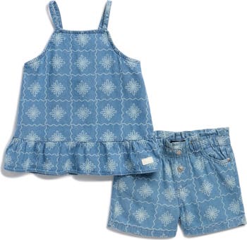 A floral-patterned cotton set that pairs a peplum tank with matching shorts is perfect for sunny days and special occasions.