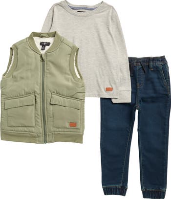 Your kiddo will stay warm during the cold-weather months in this set featuring a long-sleeved T-shirt, coordinating jeans and a fleece-lined vest.