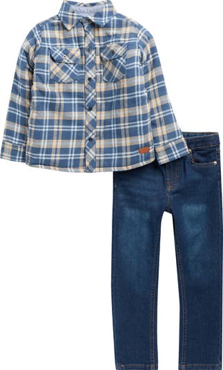A plaid pattern distinguishes a button-up shirt that's paired with skinny jeans for a stylish and comfortable outfit.