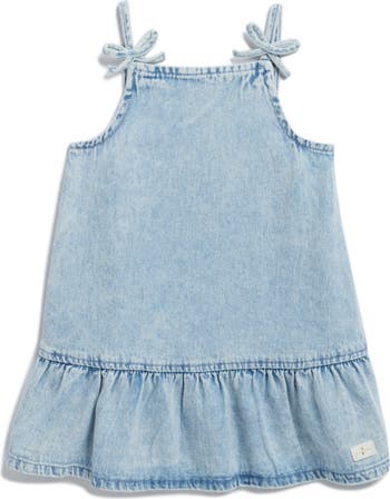 Your tiny trendsetter is ready to make a party-perfect entrance in this light-wash denim dress designed with a playful ruffle hem and sweet bow straps.