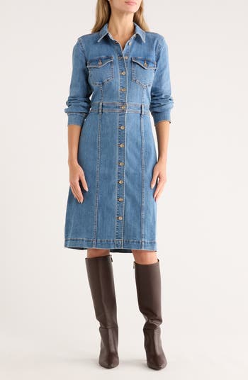 Designed with a touch of comfy stretch, this denim shirtdress features traditional details like yellow stitching and polished buttons. It pairs well with everything from casual to more styled-up footwear.