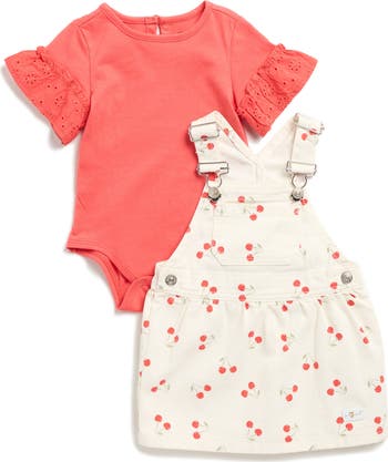 Ruffled sleeves embroidered with eyelets frame a bodysuit paired with a denim dress patterned in ripened cherries for unmistakable warm-weather charm.