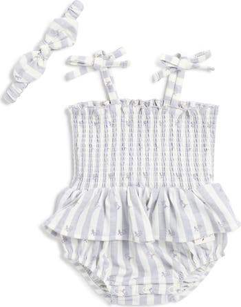 Get your little one ready for sunny days with this smocked bubble bodysuit framed by sweet bow straps and a snap bottom for easy changes.