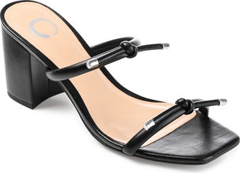 Knots join together metallic straps on a minimalistic heeled sandal finished with a trendy block heel.