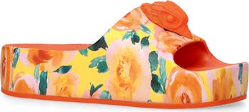 A colorful floral pattern and eagle-head hardware brighten up a casual-chic slide sandal set on a chunky sole.