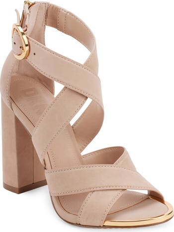 Crisscrossing vamp straps and polished hardware distinguish a statement-making sandal lifted by a wrapped block heel.
