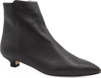 A pointy toe and kitten heel balance a luxe leather bootie set on a well-cushioned footbed for lasting comfort.