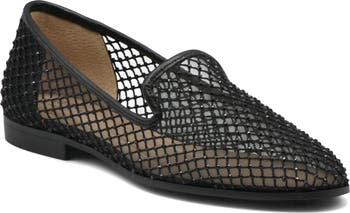 Rhinestone-studded mesh makes an iridescent statement on this party-ready loafer featuring an almond toe.