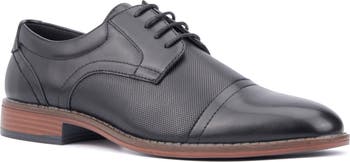 Exude polished, contemporary style in a cap-toe derby featuring textured faux-leather panels, a low block heel and grippy sole.