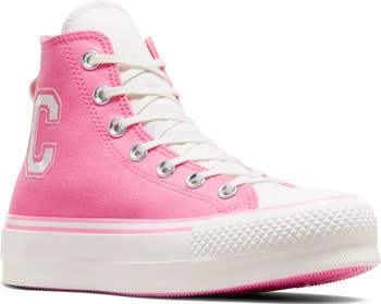Varsity style embroidery give a charming finish to a high-top canvas sneaker with a signature lace-to-toe design and platform sole.