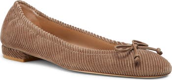A charming vamp bow adds timeless appeal to a leather ballet flat fashioned with a softly squared toe for contemporary appeal.