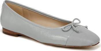 Gleaming logo hardware and a charming bow add luxe elements to a versatile ballet flat fashioned with a squared-off cap toe for modern appeal.