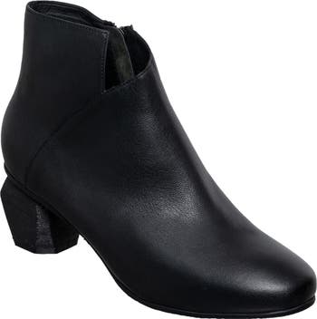 An almond toe and stacked sculptural heel balance a versatile bootie fitted with a side zipper and notched shaft for easy wear.