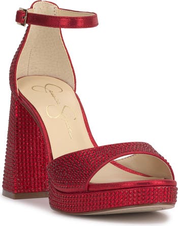 Tonal rhinestones add eye-catching glamour to a party-ready sandal lofted by a chunky platform and flared block heel.