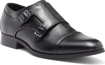 A cap toe fronts this handsome monk-strap shoe fashioned from faux leather and set on a rubber sole.
