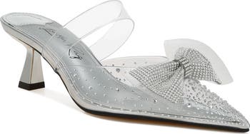 Sparkling rhinestones and a glitter-mesh bow top the transparent pointed toe of a party-perfect mule pump propped up by a comfortable kitten heel.