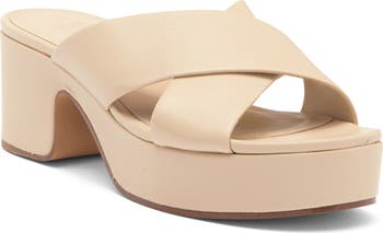A bold platform and chunky block heel elevate a crisscross-strap slide sandal rendered in smooth leather.