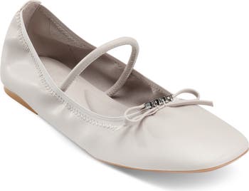Signature logo hardware adorns the instep bow and heel counter on a square-toe ballet flat fitted with a slim mary jane strap and set on a well-cushioned footbed.
