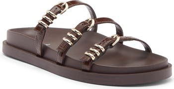 A contoured footbed supports your stride in an easy slide sandal secured by a trio of straps highlighted by buckled hardware.