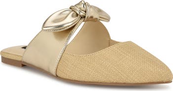 A faux-leather bow adds a fanciful flourish to a pointy-toe flat with a breezy open back.