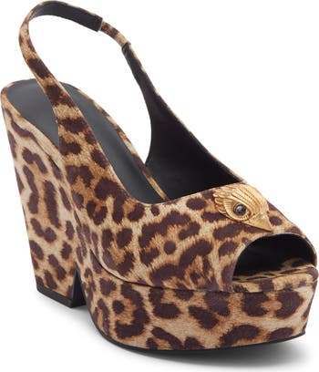 Bold in more ways than one, this slingback pump set on a platform wedge makes a statement in leopard spots.
