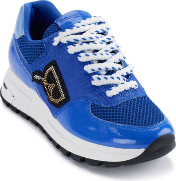 Lagerfeld shines in rhinestones at the sidewall of this sporty sneaker detailed with metallic and iridescent accents.