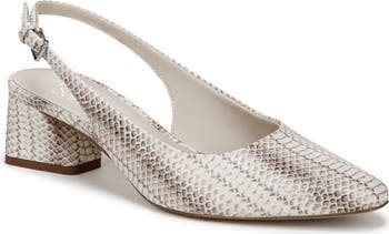 Edgy snake print wraps this slingback pump lifted by a wrapped block heel.