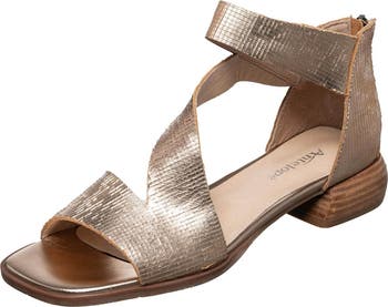 Etched squares texture the asymmetric silhouette of this sandal that's made from supple leather and lofted by a low block heel.