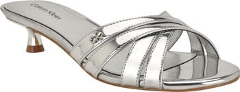 Logo-embellished crossover straps bring modern dimension to a kitten-heel slide sandal that's perfect for any occasion.
