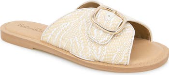 Go from the beach to boardwalk in this breezy flat sandal constructed with a woven raffia vamp and gleaming buckle.