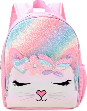 Add some sparkle to their school week with this roomy backpack adorned with an embroidered cat face and glittery appliqués.