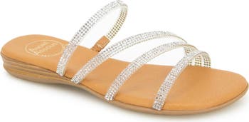 A comfort-cushioned footbed keeps your vacation-ready look comfortable in a breezy sandal shaped by slim, asymmetrical straps.