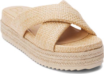 Intricately woven raffia straps crisscross atop a beach-ready slide sandal set on an espadrille-inspired platform.