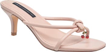 A whimsical charm suspends from the knotted straps of a sleek square toe sandal lifted by a slim heel.