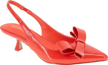 A 3D bow frames the elegant pointed toe of a polished slingback pump lifted by a flared kitten heel.
