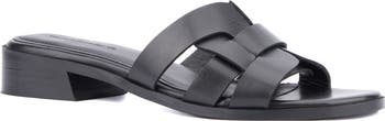 A woven vamp enhances the sunny-day vibe of an easy-wear slide sandal lifted by a low stacked heel.