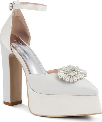 A pearly brooch heightens the glamour of this lustrous satin platform pump secured by an ankle strap and lifted by a wrapped block heel.