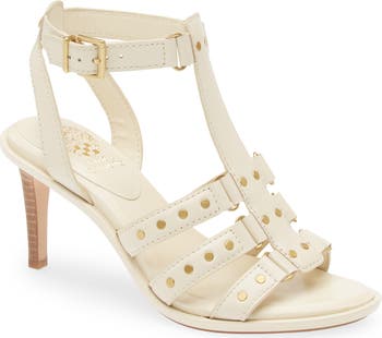 Edgy goldtone flat studs outline the T-strap silhouette of this leather sandal lofted by a slender heel.