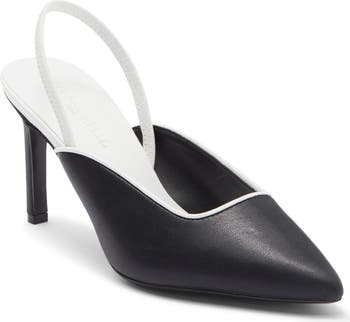 A colorblock design enhances the chic style of a sassy slingback pump framed by a pointed toe and stiletto heel.