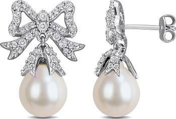 Dainty pavè bows stack on top of lustrous freshwater pearl drops in these earrings made from icy sterling silver.