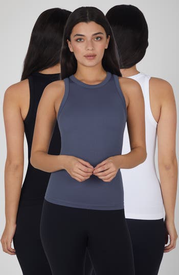 Stock up on essentials with this trio of seamless tank tops crafted from stretchy fabric.