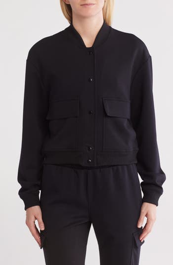 Update your collection with this wardrobe-staple bomber jacket crafted from soft scuba knit and finished with a snap closure.