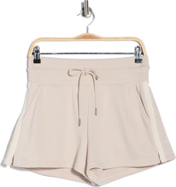 Side stripes enhance the sporty style of these comfortable French terry shorts framed by an elastic-drawstring waist and handy pockets.