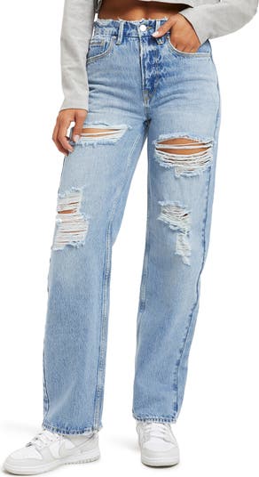 Distressed rips add to the relaxed vibe of nonstretch-cotton denim jeans in a faded wash with a high, gap-proof waistband that flatters every body.