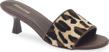Woven faux raffia forms earthy flowers atop the strap of a summery slide sandal lifted by a demure kitten heel.