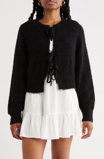 A trio of floppy bows frame the front opening of a whimsy, waist-length cardigan knit from eyelash-textured knit.