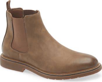 A burnished finish brings a vintage-inspired aesthetic to this season-spanning Chelsea boot set upon a grippy sole.