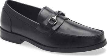 A polished horsebit tops a handsome faux-leather loafer featuring a classic moc toe and grounded by a low block heel.