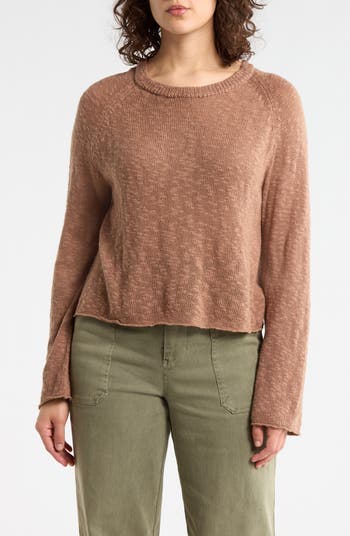 A loose bell-hem gives an angelic finish to the sleeves of this light and breezy top knit from soft, textured cotton-blend threads.